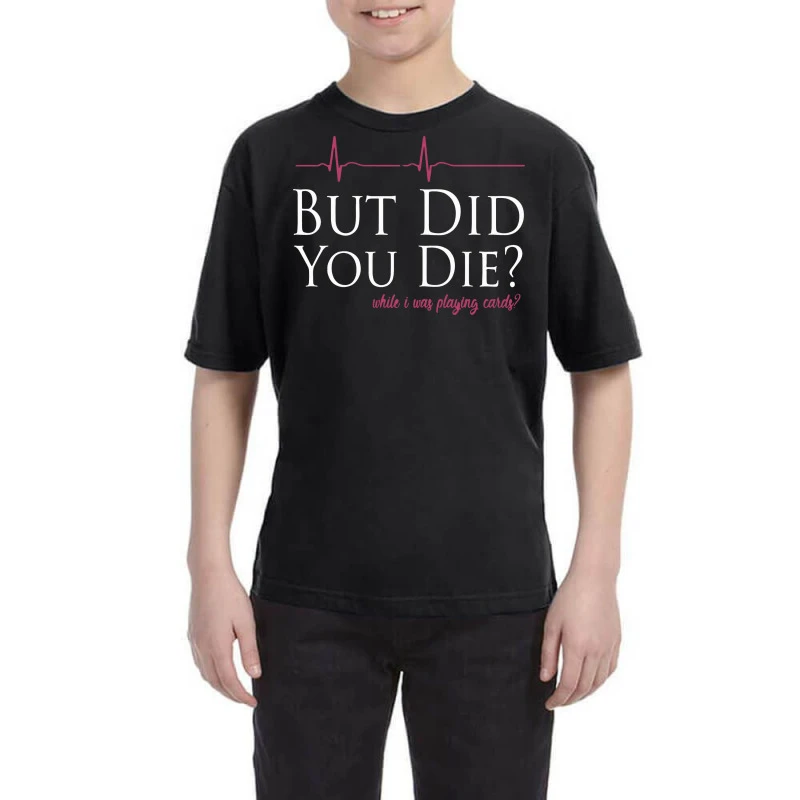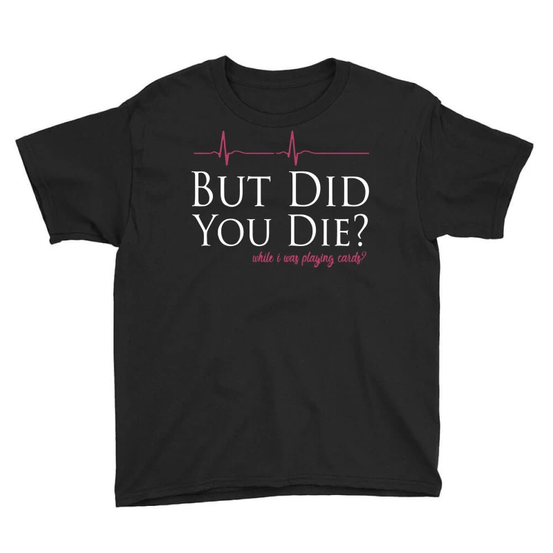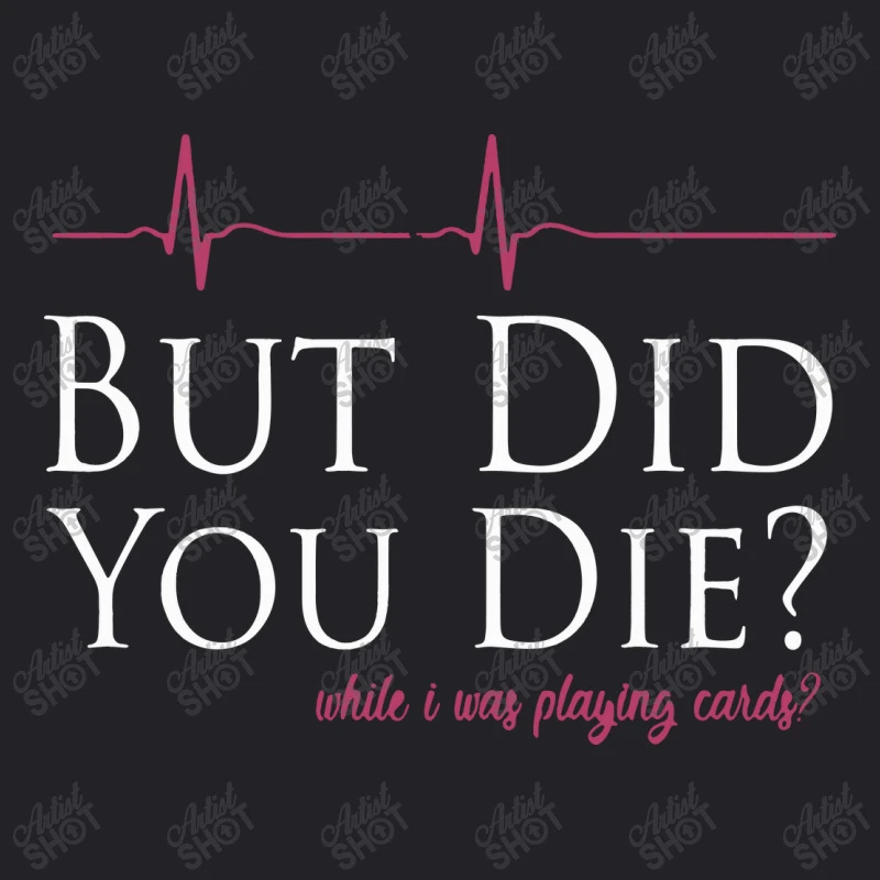 Digital printing is an amazing process that involves your artwork “But Did You Die While I Was Playing Cards” being processed by a computer and then printed directly onto the surface of your product. Digital printing is not a heat transfer or applique, as the ink directly adheres to the fabric of your shirt. Each printing process has its strengths, and our artwork team will weigh these when deciding which to use for your art.