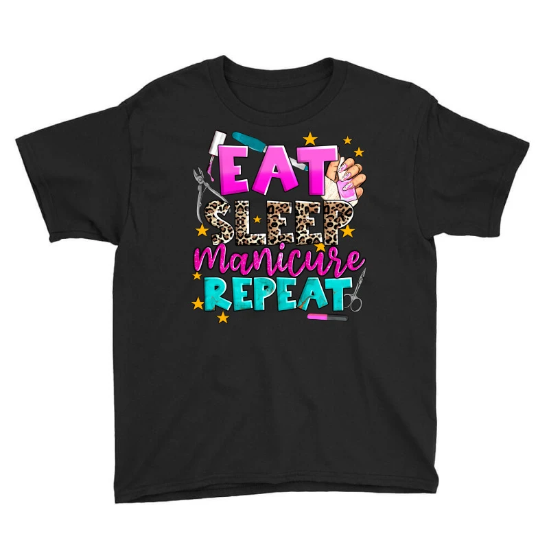 Digital printing is an amazing process that involves your artwork “Eat Sleep Manicure Repeat” being processed by a computer and then printed directly onto the surface of your product. Digital printing is not a heat transfer or applique, as the ink directly adheres to the fabric of your shirt. Each printing process has its strengths, and our artwork team will weigh these when deciding which to use for your art.