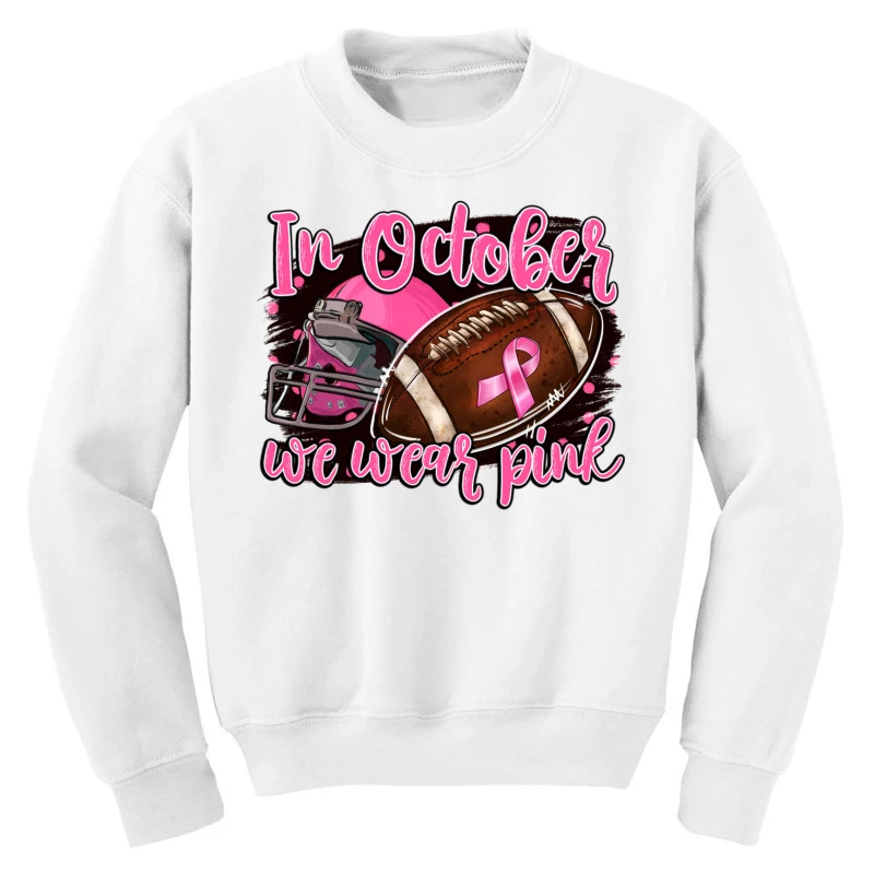 Plot Printing Consists of both Flock and Flex Print, This process transfers your artwork “In October We Wear Pink With Football”