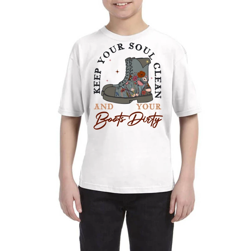 Digital printing is an amazing process that involves your artwork “Keep Your Soul Clean And Your Boots Dir” being processed by a computer and then printed directly onto the surface of your product. Digital printing is not a heat transfer or applique, as the ink directly adheres to the fabric of your shirt. Each printing process has its strengths, and our artwork team will weigh these when deciding which to use for your art.