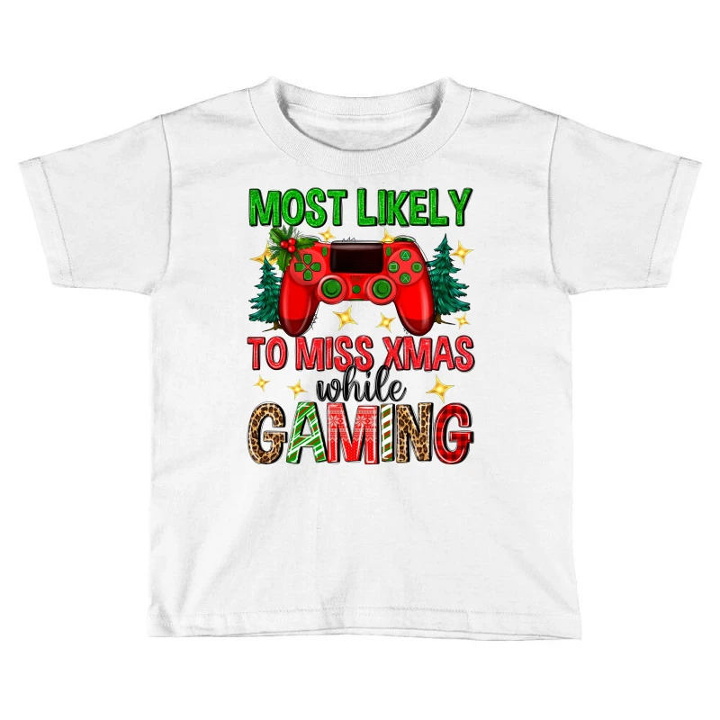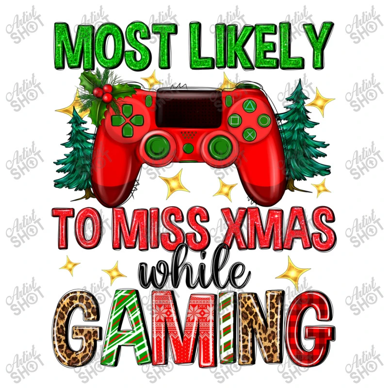 Digital printing is an amazing process that involves your artwork “Most Likely To Miss Xmas While Gaming” being processed by a computer and then printed directly onto the surface of your product. Digital printing is not a heat transfer or applique, as the ink directly adheres to the fabric of your shirt. Each printing process has its strengths, and our artwork team will weigh these when deciding which to use for your art.