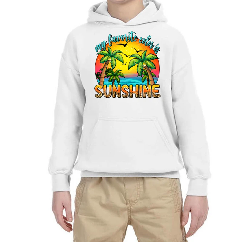 Digital printing is an amazing process that involves your artwork “My Favorite Color Is Sunshine” being processed by a computer and then printed directly onto the surface of your product. Digital printing is not a heat transfer or applique, as the ink directly adheres to the fabric of your shirt. Each printing process has its strengths, and our artwork team will weigh these when deciding which to use for your art.
