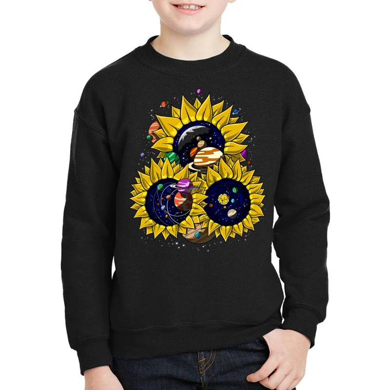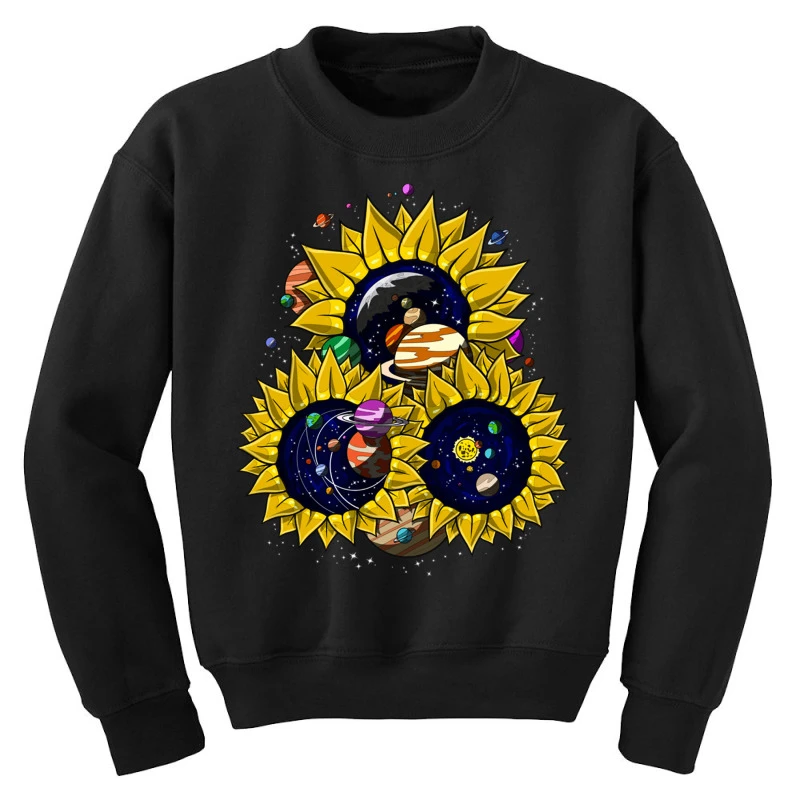 Plot Printing Consists of both Flock and Flex Print, This process transfers your artwork “Space Sunflowers Exploration”